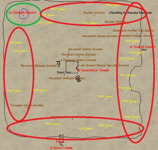 This shard can drop off most “rock” model mobs in Akheva Ruins. It also can drop off shadow reavers and Xi Xaui, both which have death character models. It’s best to setup camp in the yellow circle and kill mobs / traps in the red circle. Some of the rock mobs have a lot of hp.
